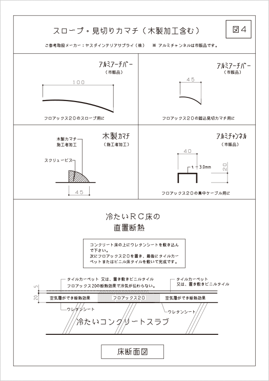 - 柱型、壁際、見切り部分はその形状に合わせて本製品をカット。- カットは電動丸ノコまたはカッターナイフで簡単にできます。フロアックス20はどの位置でカットしても強度は変わりません。